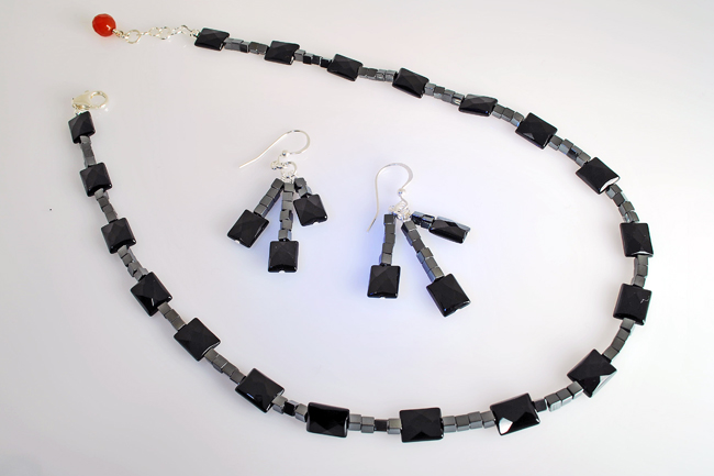 The faceted onyx and cubed hematite in this necklace glitter like diamonds, and will certainly make you feel like a million bucks! Shown 16.5″ to 17″ long with faceted carnelian extender.