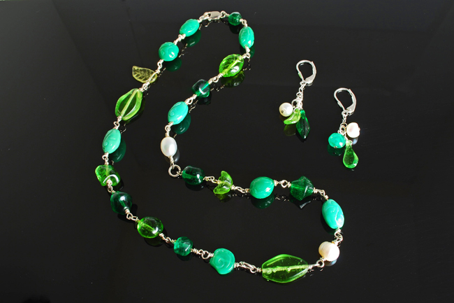 Stunning emerald toned glass from India in varied shapes, sizes and textures mix with luminous white freshwater coin pearls in this beautiful necklace! Shown 17″ long.