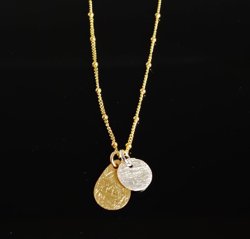 These delicate textured sterling silver and gold filled “dog tags” are suspended from an 18″ 14K gold filled beaded necklace that is perfect for summer and spring!