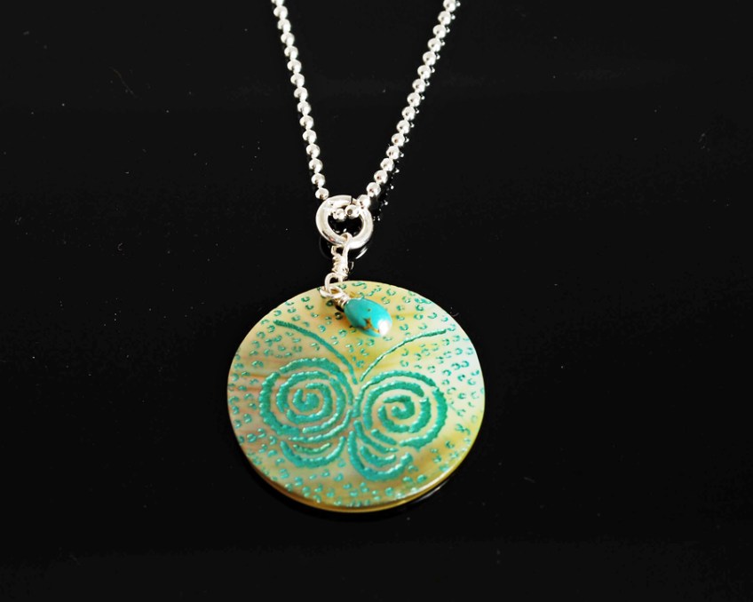 Another beautiful pendant in shades of turquoise and silver. Laser etched sea shell has a whimsical butterfly-like pattern accented by a turquoise bead. 18″ beaded sterling silver chain.