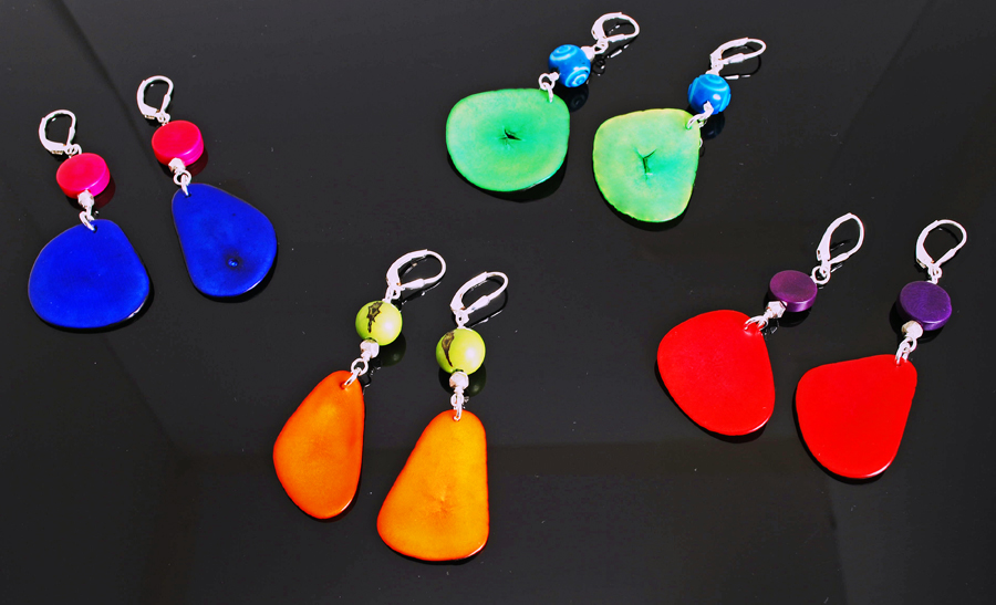 These incredibly colorful light-as-air earrings are made from dyed plaintains, lentils and beans and set in sterling silver to dangle playfully from your ears. Total drop is 1-1/” to 2″. You’ll hardly know they’re there, but everyone else will!