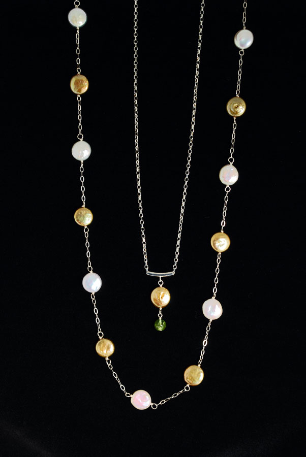 Treat yourself to this 24″ lustrous strand of gold and white coin pearls strung together on a delicate sterling silver chain and accented with a peridot end bead. Pair it with our 18″ gold coin and peridot drop necklace for a fabulous look, either together or separately!