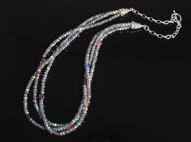 Three strands of fumed faceted labradorite glitter like diamonds and will put a subtle sparkle in whatever you wear. Warmly accented by a multitude of faceted oval shaped multi-colored tourmaline. Finely finished with stamped sterling silver cones and toggle clasp. About 18″ long.
