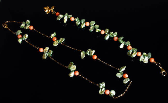 Pale green freshwater “cornflake” pearls and pink coral “berries” lend a breath of fresh air to the midwinter mist! Necklace is 18″ long on 14K GF chain. Matching bracelet is about 7.5″ long with vermeil leaf cluster dangle. Both will look great with your pink jacket or sweater!