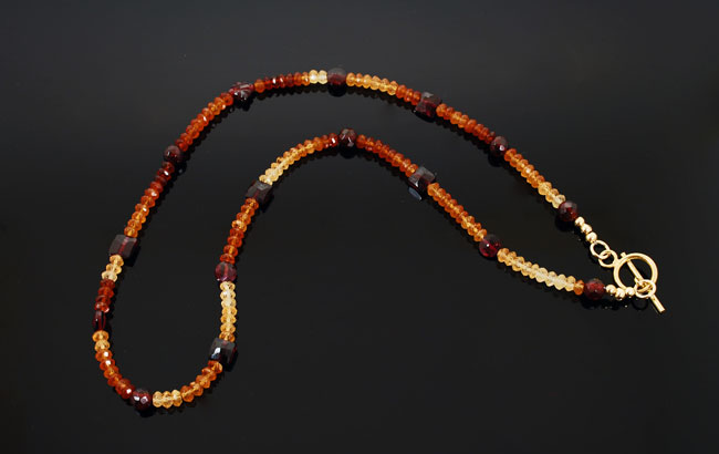 Cabernet colored garnet beads in different shapes and textures punctuate this 18″ strand of variegated hessonite (also in the garnet family). A true fall statement!