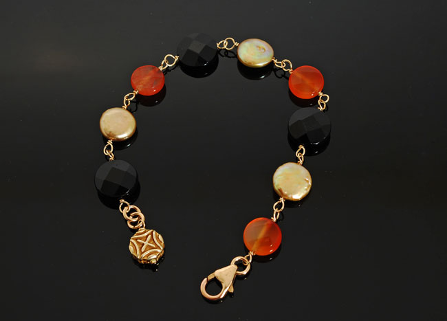 A subtle understated piece to convey the feeling of autumn leaves and cozy fires! Faceted black onyx and carnelian discs are enhanced by luminous champagne colored coin pearls and accented by a beautiful stamped gold filled fob. 14K gold filled, 7 to 7.5″ long.