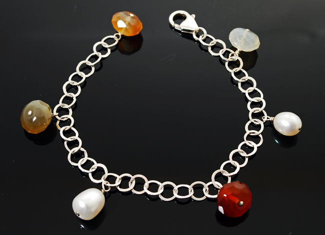 Self-adjusting gemstone and pearl “charm” bracelet. Some have sterling silver insect and flower charms. Wear one or more together, or combine them with your watch or other bracelets! Sample shown 7-7.5″ long with faceted carnelian rondels and white freshwater pearl (not available). Other combinations available.