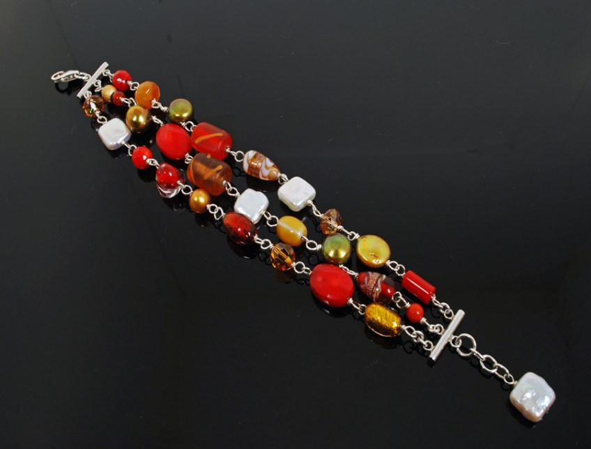 Rich, luminous collection of rich red, green and gold gemstones, pearls, art glass and other materials link together on three strands with coordinating accent stone. Shown 7-7.5″ long. Other color combinations available by special order.