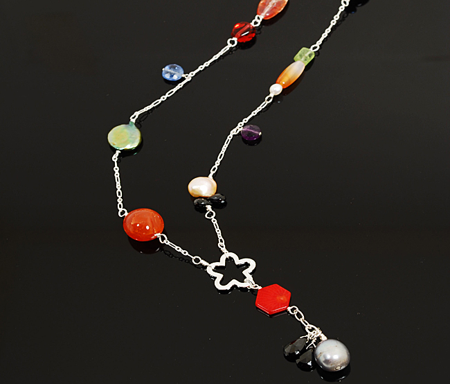 Want to make your plainest black dress stand out? Just throw on this 34″ cornucopia of colorful gemstones, crystals and pearls and you will shine! Accented with a large grey freshwater pearl and black spinel briolettes.