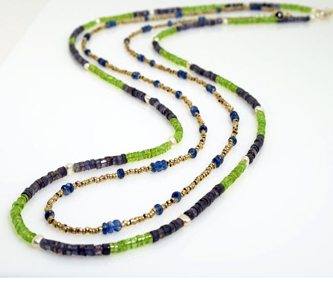 These 34″ strands of green peridot/denim blue iolite and African silver/royal blue kyanite, are great alone or together. Wear them long or doubled up!